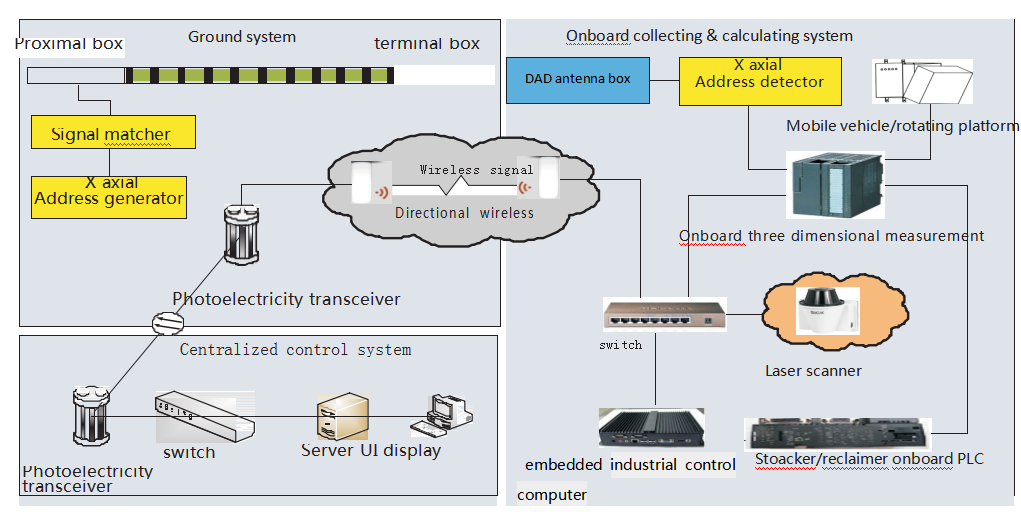 Laser intelligent measurement and control system adopts gray Line positioning technology and laser scanner technology, achieving three-dimensional point cloud data.The stereo shape of material pile can be restored by using high simulation VR technology and the volume of any material area can be calculated by the principle of calculus. Meanwhile, the height of material position at any point is the core data to automatic material piling and taking in unmanned material yard.